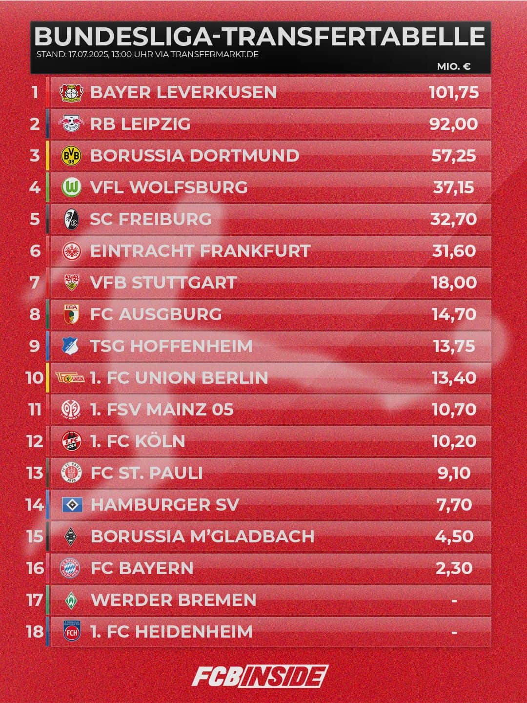 Und der deutsche Rekordmeister? Der FC Bayern hat in den letzten Wochen zahlreiche Absagen und Rückschläge auf dem Transfermarkt kassiert und liegt in der Liste der Transferausgaben abgeschlagen auf Rang 16 – mit gerade einmal 2,3 Millionen Euro. Diese wurden für die Teilnahme der beiden ablösefreien Neuzugänge Jonathan Tah und Tom Bischof an der Klub-WM fällig.