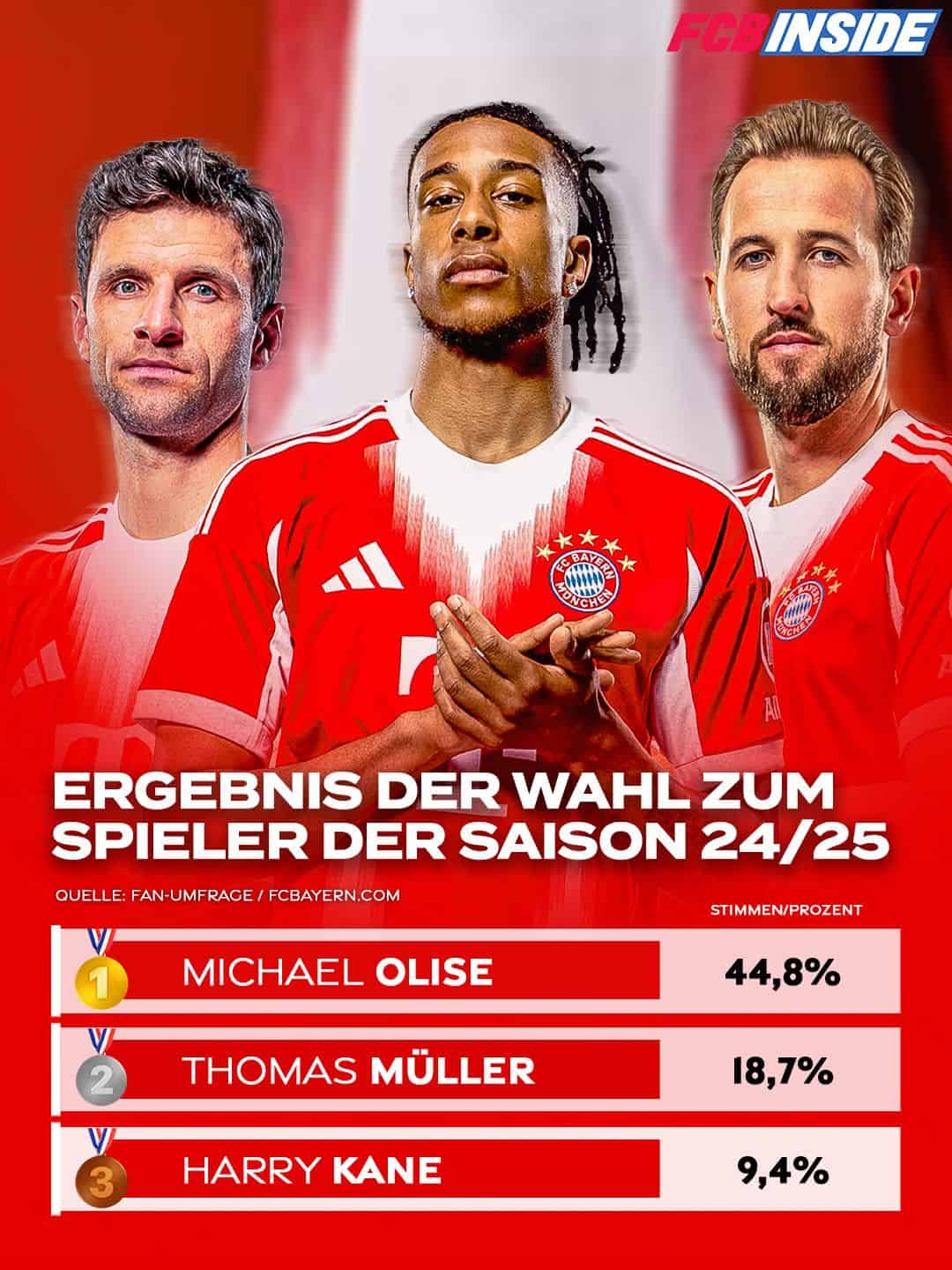 Die Bayern-Fans haben gewählt – und das Votum ist eindeutig: Michael Olise ist der Bayern-Spieler der Saison 2024/25. Mit beeindruckenden 44,8 Prozent der Stimmen ließ der französische Flügelspieler bei der offiziellen Abstimmung sowohl Vereinsikone Thomas Müller (18,7 Prozent) als auch Torjäger Harry Kane (9,4 Prozent) deutlich hinter sich.