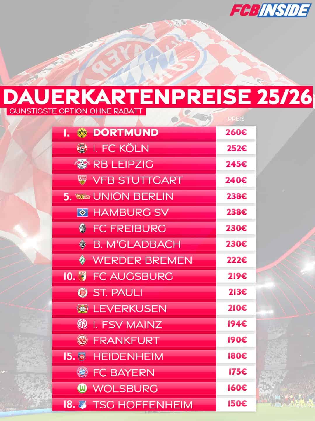Im Vergleich zu vielen anderen Vereinen bewegen sich die Münchner Preise im unteren Bereich. Auch Frankfurt (190 Euro), Heidenheim (180 Euro) und Mainz (194 Euro) bieten relativ günstige Optionen. Insgesamt haben sechs Klubs ihre Preise erhöht – darunter auch der FC Bayern.