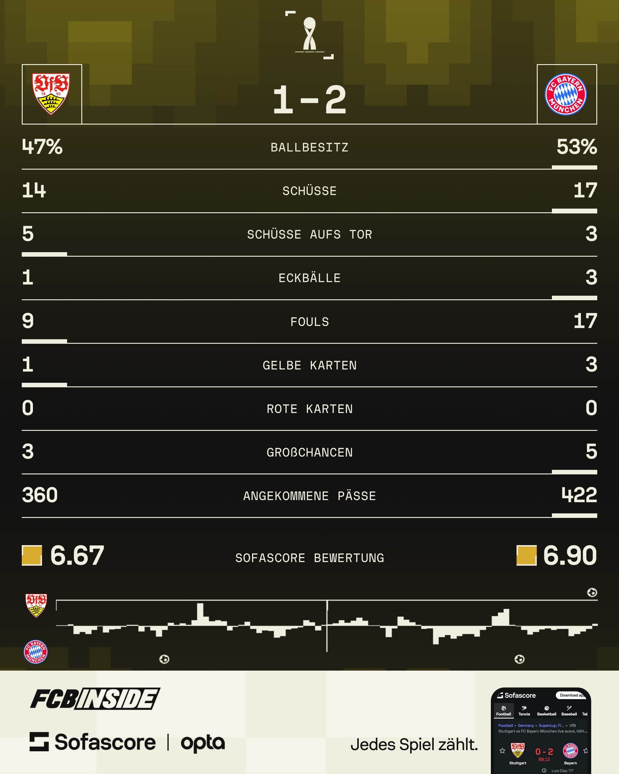 Der VfB ließ trotz des Rückstands nicht locker. Jamie Leweling verkürzte in der Nachspielzeit (90+4) zum 1:2. Der Treffer kam jedoch zu spät. Der FCB brachte das Ergebnis über die Ziellinie.