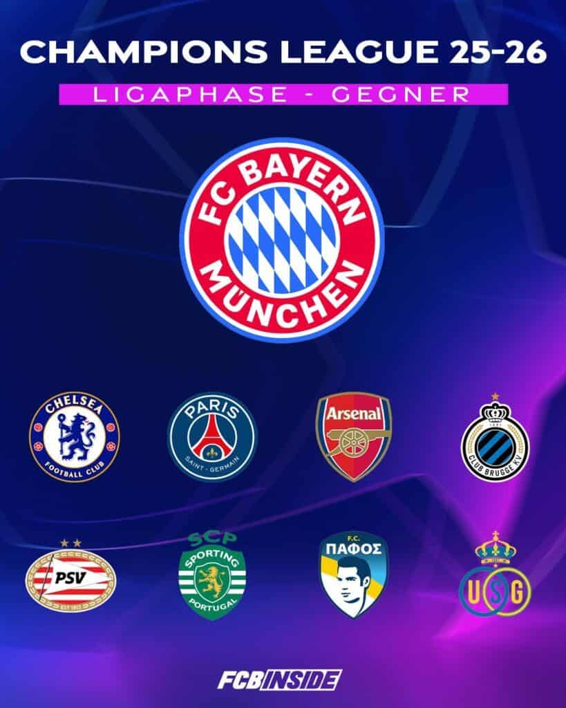 Der FC Bayern hat keine einfache Gruppe erwischt. Es geht für die Münchner gegen Chelsea, PSG, Brügge, Arsenal, Sporting Lissabon, PSV Eindhoven, Union Saint-Gilloise und Pafos FC.