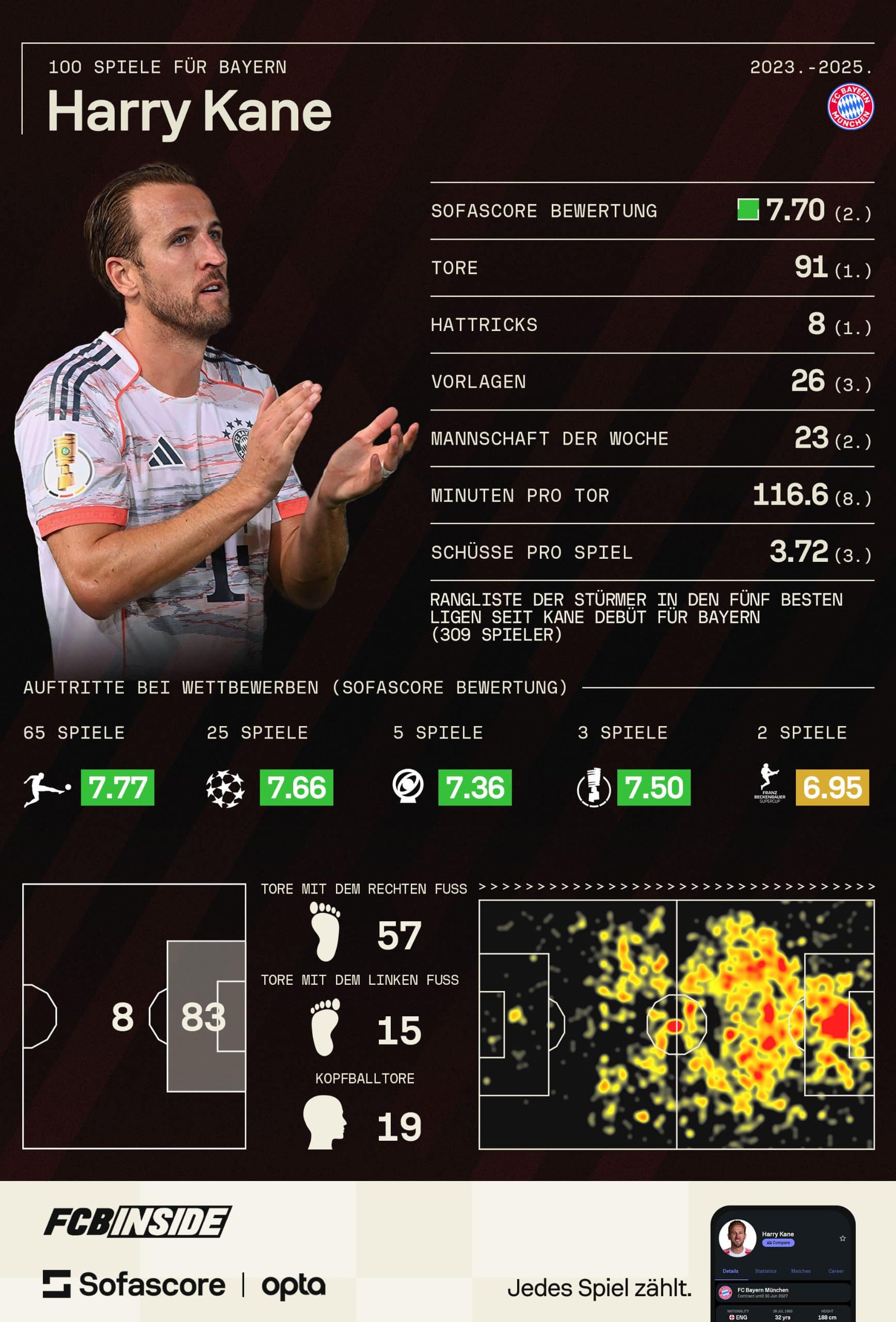 Mit dieser Bilanz könnte Kane schon im Herbst die 100-Tore-Marke im Bayern-Trikot knacken. Zum Vergleich: Robert Lewandowski brauchte 136 Partien für diesen Wert, Gerd Müller sogar 138. Kane wäre damit der schnellste 100-Tore-Stürmer der Klubgeschichte.