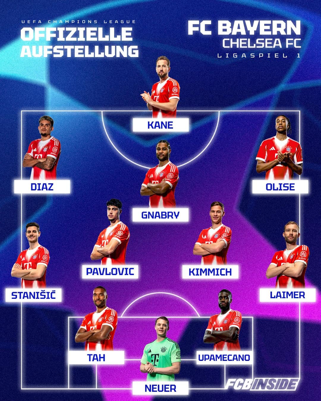FC Bayern: Neuer – Laimer, Upamecano, Tah, Stanisic – Kimmich, Pavlovic – Olise, Gnabry, Díaz – Kane