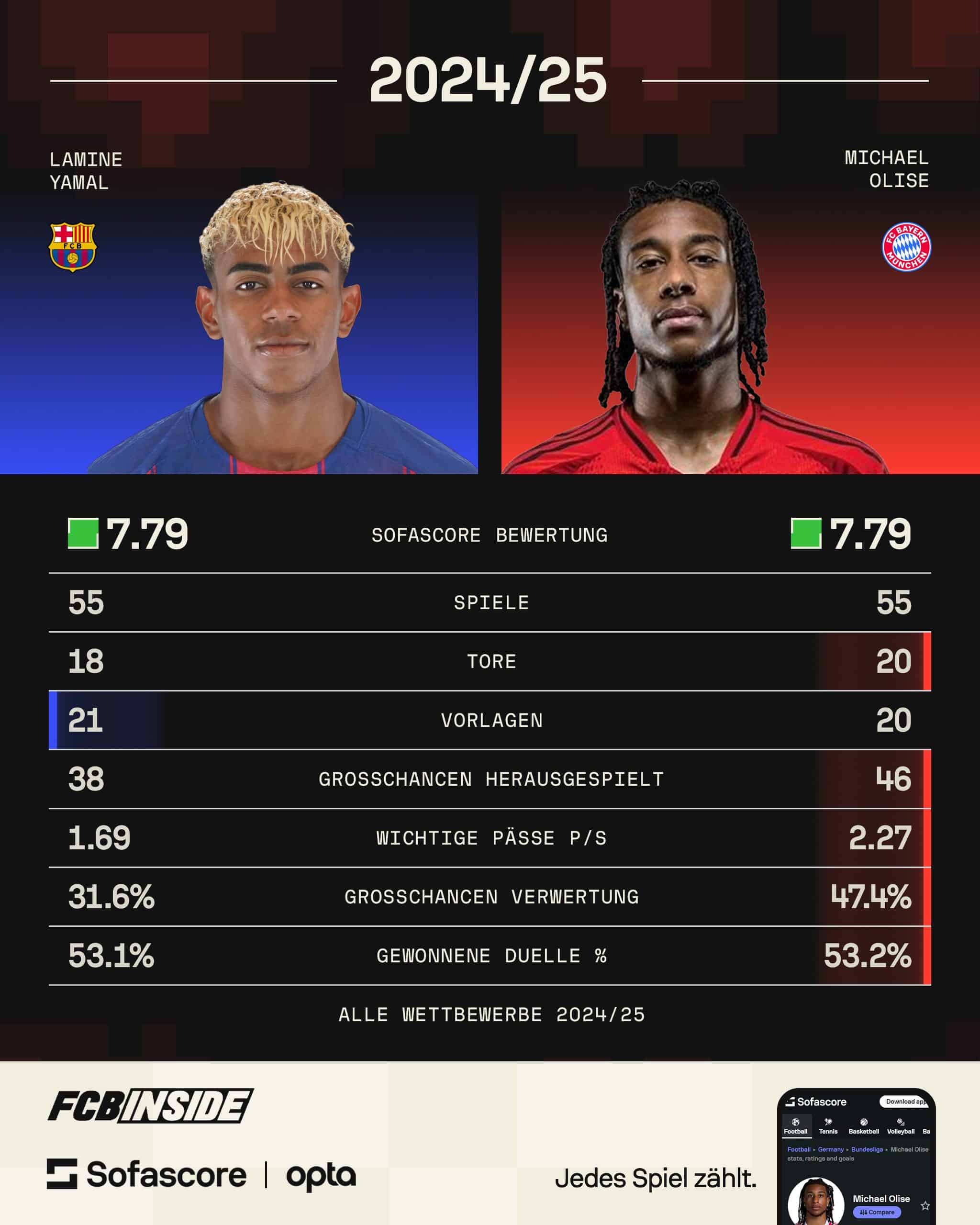 Das französische Fachmagazin France Football, das den Ballon d’Or organisiert, gibt drei Kriterien für die Wahl vor: individuelle Leistungen (Tore, Vorlagen, Defensivwerte), Mannschaftserfolg und Fair Play. Besonders die Tatsache, dass Yamal mit nur einer Vorlage mehr den zweiten Platz belegte, während Olise auf Rang 30 durchgereicht wurde, sorgt für Kopfschütteln. In allen anderen relevanten Werten hatte der Bayern-Profi die Nase vorn.