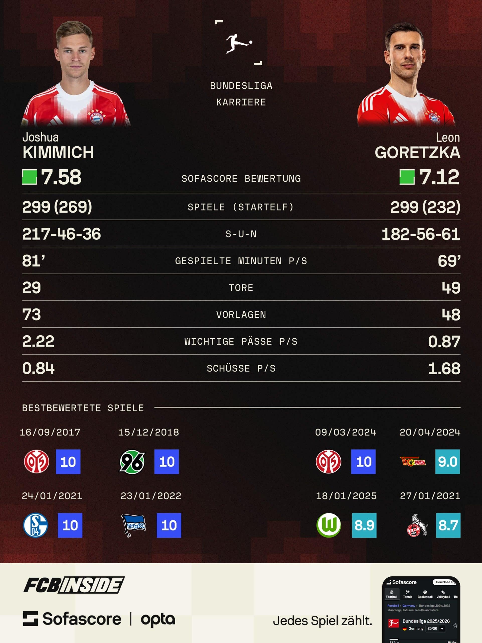 Während Kimmich seit seinem Bundesliga-Debüt 2015 ausschließlich für den FC Bayern spielte, absolvierte Goretzka zunächst 116 Spiele für den FC Schalke 04, ehe er nach München wechselte. Seitdem sind beide eng miteinander verbunden: In 159 Partien standen sie gemeinsam auf dem Platz, feierten 109 Siege und erlitten lediglich 26 Niederlagen.