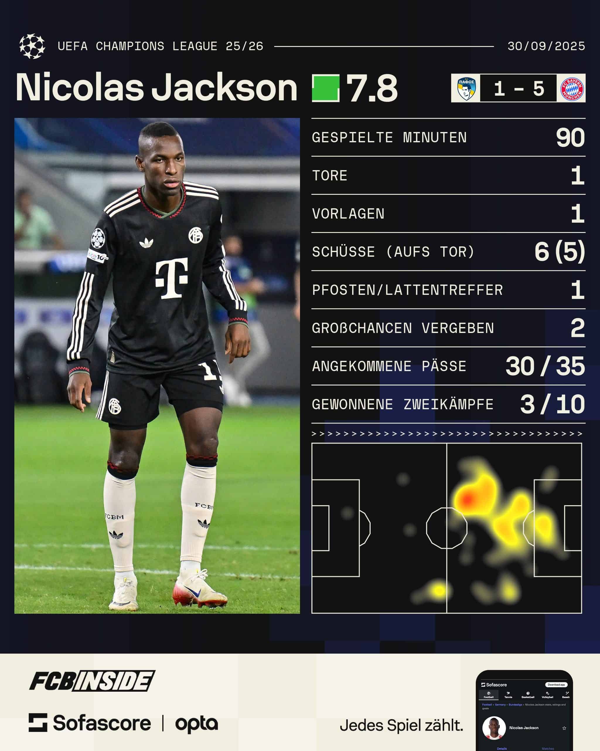 Es war ein Abend, den Nicolas Jackson so schnell nicht vergessen wird. Der vom FC Chelsea ausgeliehene Angreifer durfte in Zypern zum zweiten Mal von Beginn an ran – und zeigte prompt, wie wichtig er für die Münchner werden kann. Nach einer knappen halben Stunde stand der Senegalese goldrichtig: Olise legte vor, Jackson nahm den Ball mit und vollendete zum 3:0. Schon zuvor hatte er mit einem cleveren Doppelpass das 2:0 von Raphaël Guerreiro vorbereitet.