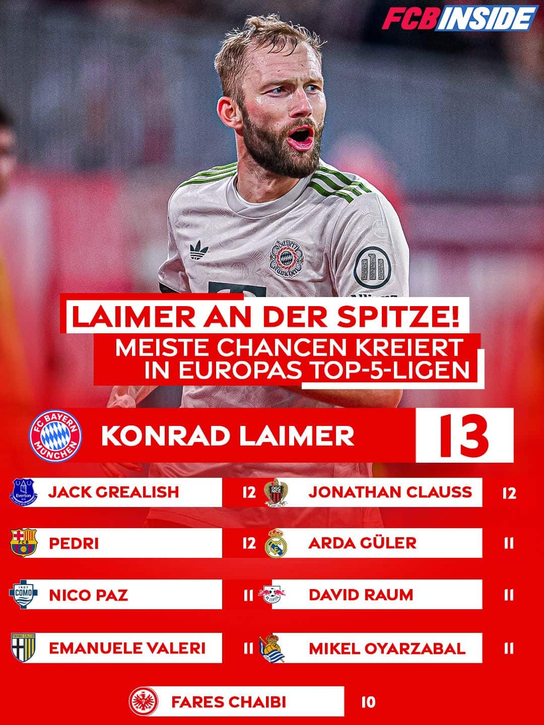 Doch Laimer liefert aktuell weit mehr als defensive Stabilität. Laut einer Erhebung des Datenportals Squawka führt er mit 13 kreierten Großchancen das Ranking der europäischen Top-5-Ligen an. Damit liegt er nicht nur vor Bayern-Stars wie Harry Kane oder Michael Olise, sondern übertrifft auch internationale Topspieler wie Jack Grealish, Pedri und Jonathan Clauss (jeweils 12). Selbst junge Ausnahmetalente wie Arda Güler oder Nico Paz (beide 11) finden sich hinter dem Bayern-Allrounder wieder.