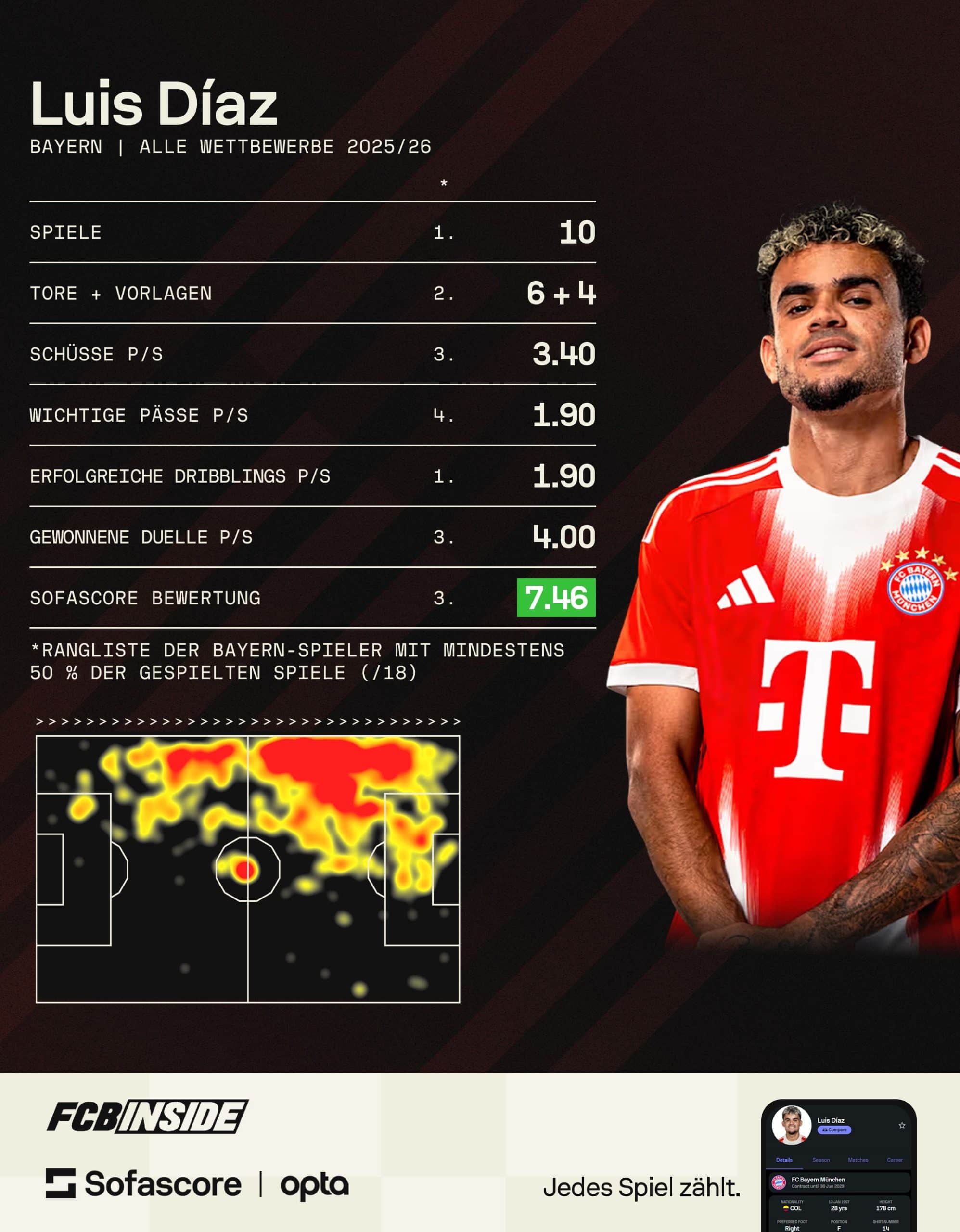 Damit bestätigt Díaz früh die Hoffnungen, die in ihn gesetzt wurden. Für bis zu 75 Millionen Euro wechselte der frühere Liverpool-Star im Sommer an die Isar – ein Preis, der mittlerweile fast schon als Schnäppchen erscheint.