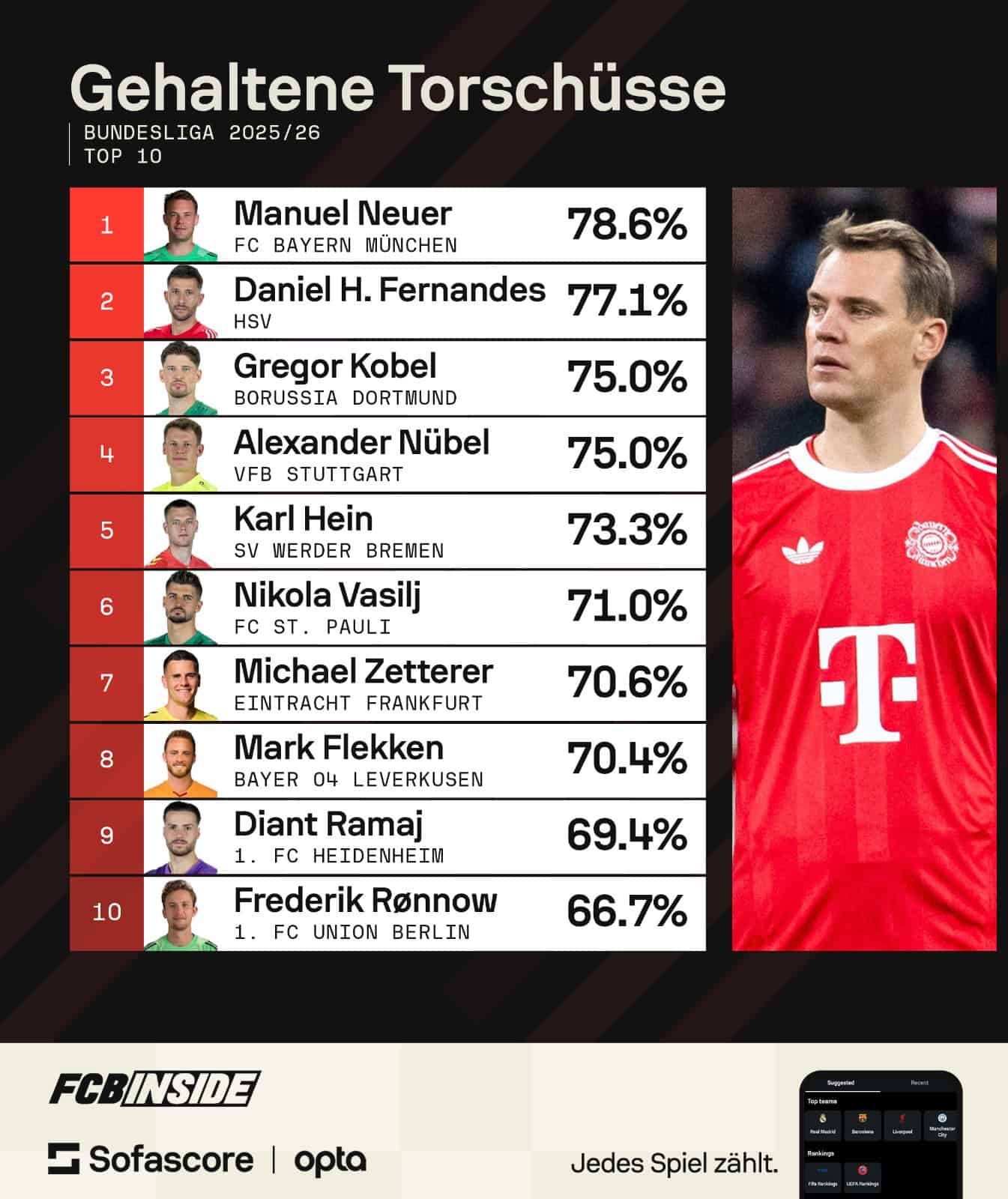 Rein sportlich spricht alles für Neuer. Mit einer Quote von 78,6 Prozent gehaltener Torschüsse führt er das Bundesliga-Ranking in dieser Saison souverän an. Hinter ihm folgen Daniel Fernandes (HSV) mit 77,1 Prozent sowie Gregor Kobel (BVB) und Alexander Nübel (VfB Stuttgart) mit jeweils 75 Prozent.