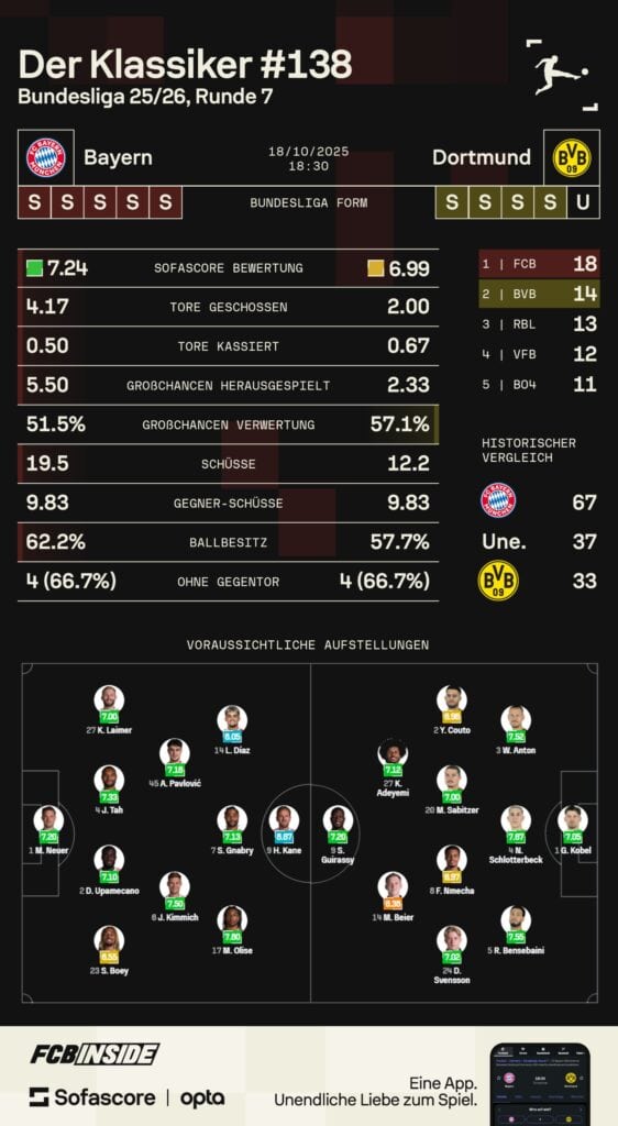 Wenn der FC Bayern in wenigen Stunden Borussia Dortmund empfängt, geht es nicht nur um drei Punkte, sondern auch um viel Prestige. Diese Zahlen zeigen, warum der Rekordmeister als (klarer) Favorit ins Spiel geht.