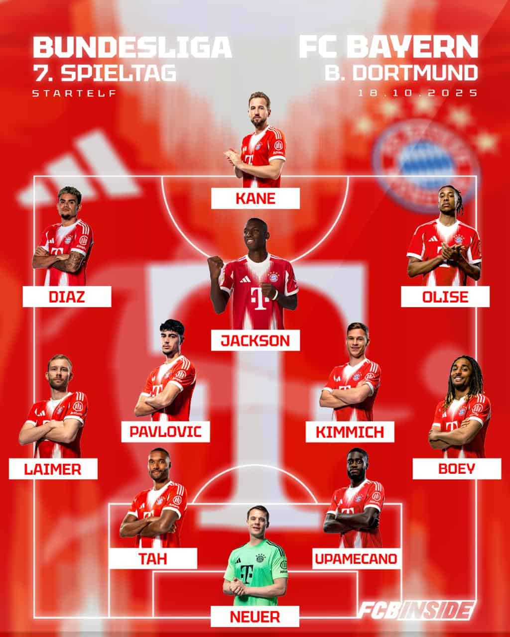 FC Bayern: Neuer – Boey, Upamecano, Tah, Laimer – Kimmich, Pavlovic – Olise, Jackson, Luis Diaz – Kane