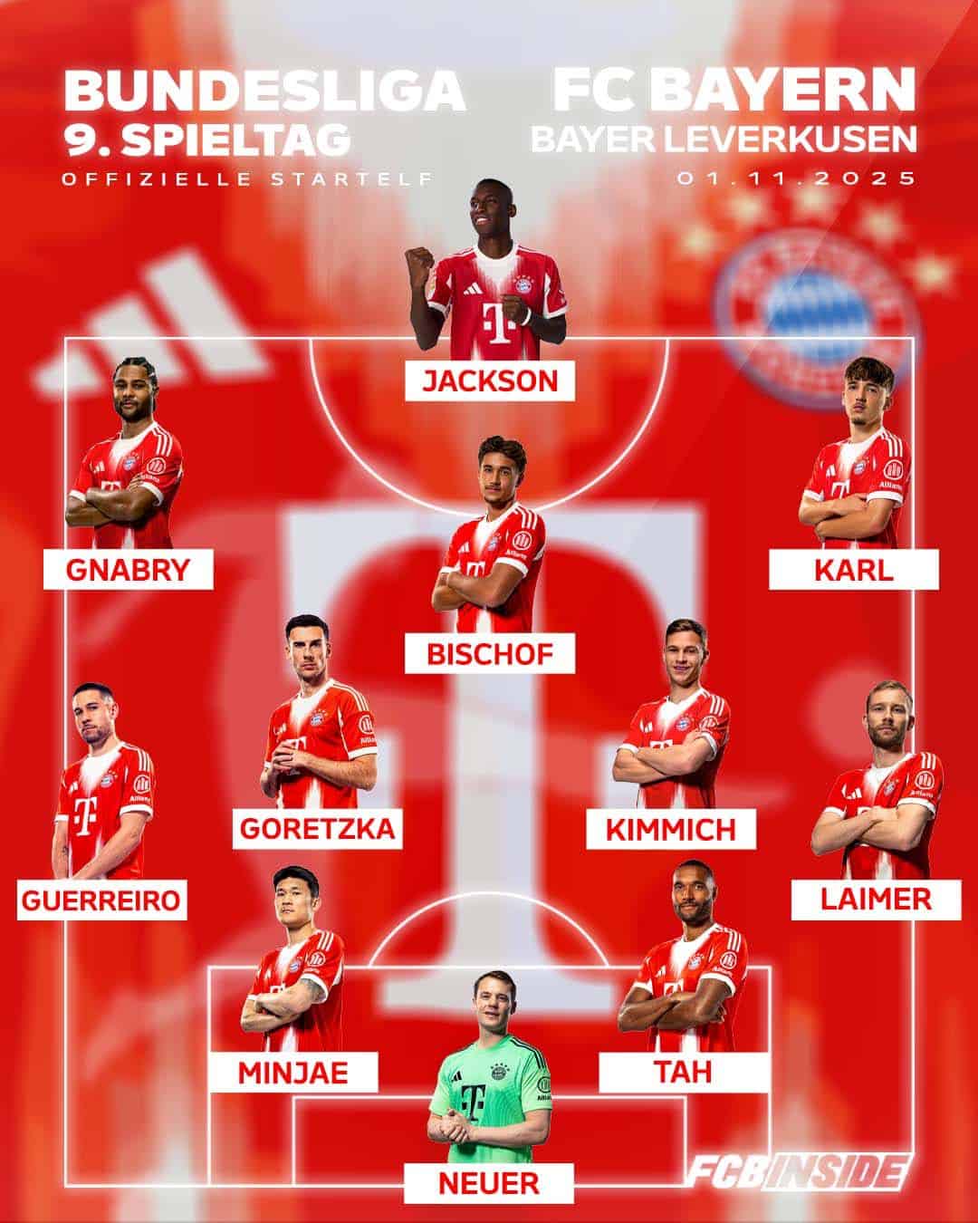 Im defensiven Mittelfeld beginnen Joshua Kimmich und Leon Goretzka. Das offensive Trio bilden Serge Gnabry, Tom Bischof und Lennart Karl. Im Sturm beginnt Nicolas Jackson.