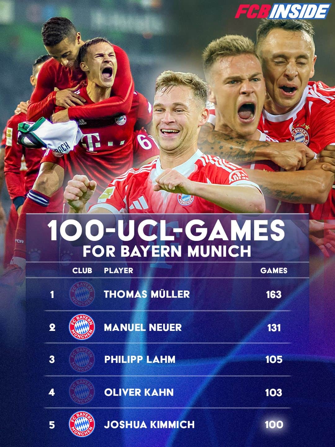 Beim Champions-League-Spiel gegen Paris Saint-Germain wird Joshua Kimmich seinen 100. Auftritt in der Königsklasse für den FC Bayern absolvieren. Damit steht er auf dem fünften Platz der CL-Rekordspieler des FCB und ist kurz davor, sich den von Oliver Kahn (103 Spiele) gehaltenen 4. Platz zu sichern.