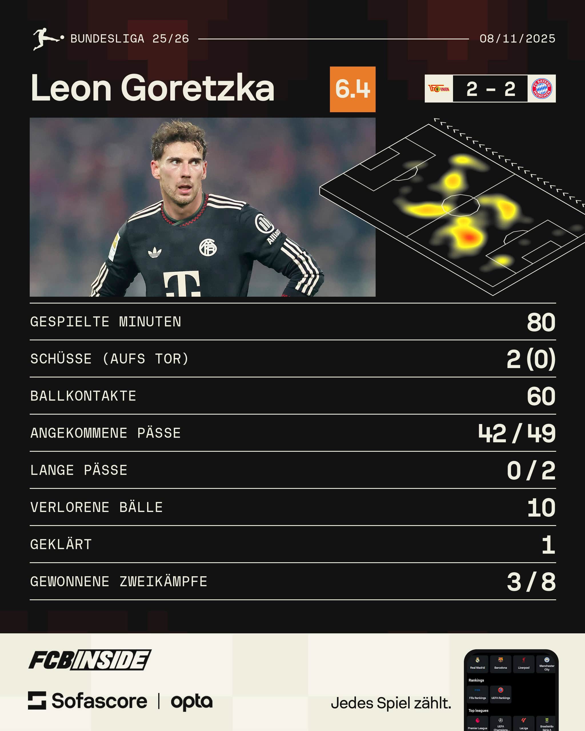 Die Statistik spricht aktuell ebenfalls gegen Goretzka. Gegen Union verzeichnete er zehn Ballverluste, brachte keinen seiner beiden langen Pässe an den Mann und kam insgesamt auf nur 60 Ballkontakte – zu wenig für einen zentralen Mittelfeldspieler im Bayern-System.