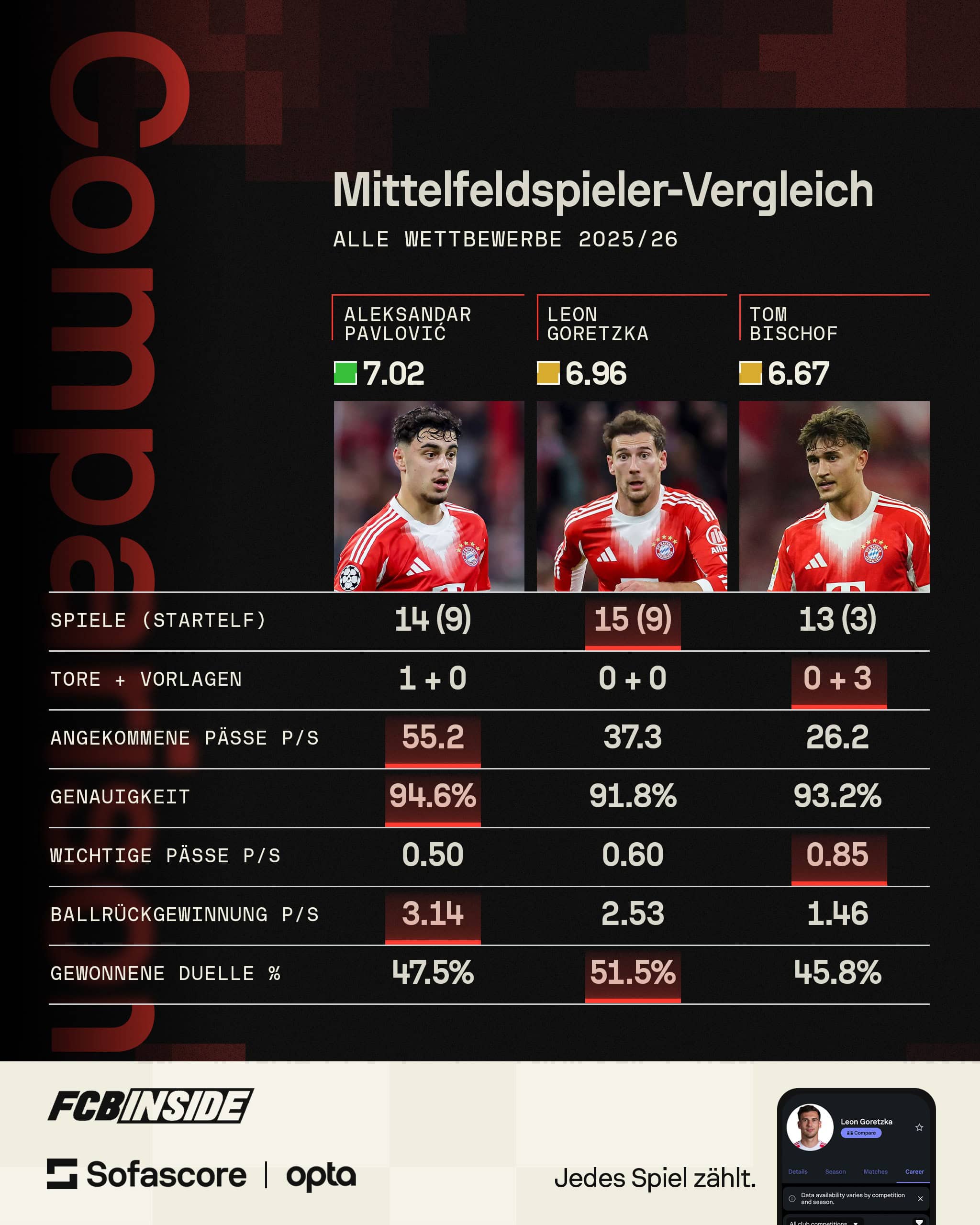 Mit dem aufstrebenden Bischof, dem konstant starken Pavlovic und der Rückkehr des derzeit verletzten Jamal Musiala sind die Münchner im zentralen Mittelfeld ohnehin gut aufgestellt.