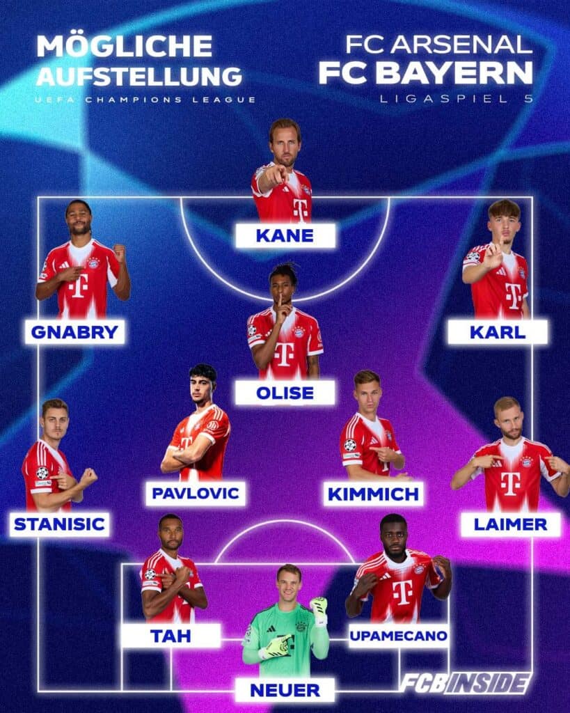 Die voraussichtliche Bayern-Startelf im Überblick: Neuer – Stanisic, Upamecano, Tah, Laimer – Kimmich, Pavlovic – Karl, Olise, Gnabry – Kane