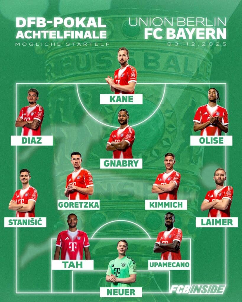 Die voraussichtliche Bayern-Startelf im Überblick: Neuer – Stanisic, Upamecano, Tah, Laimer – Kimmich, Goretzka – Olise, Gnabry, Diaz – Kane