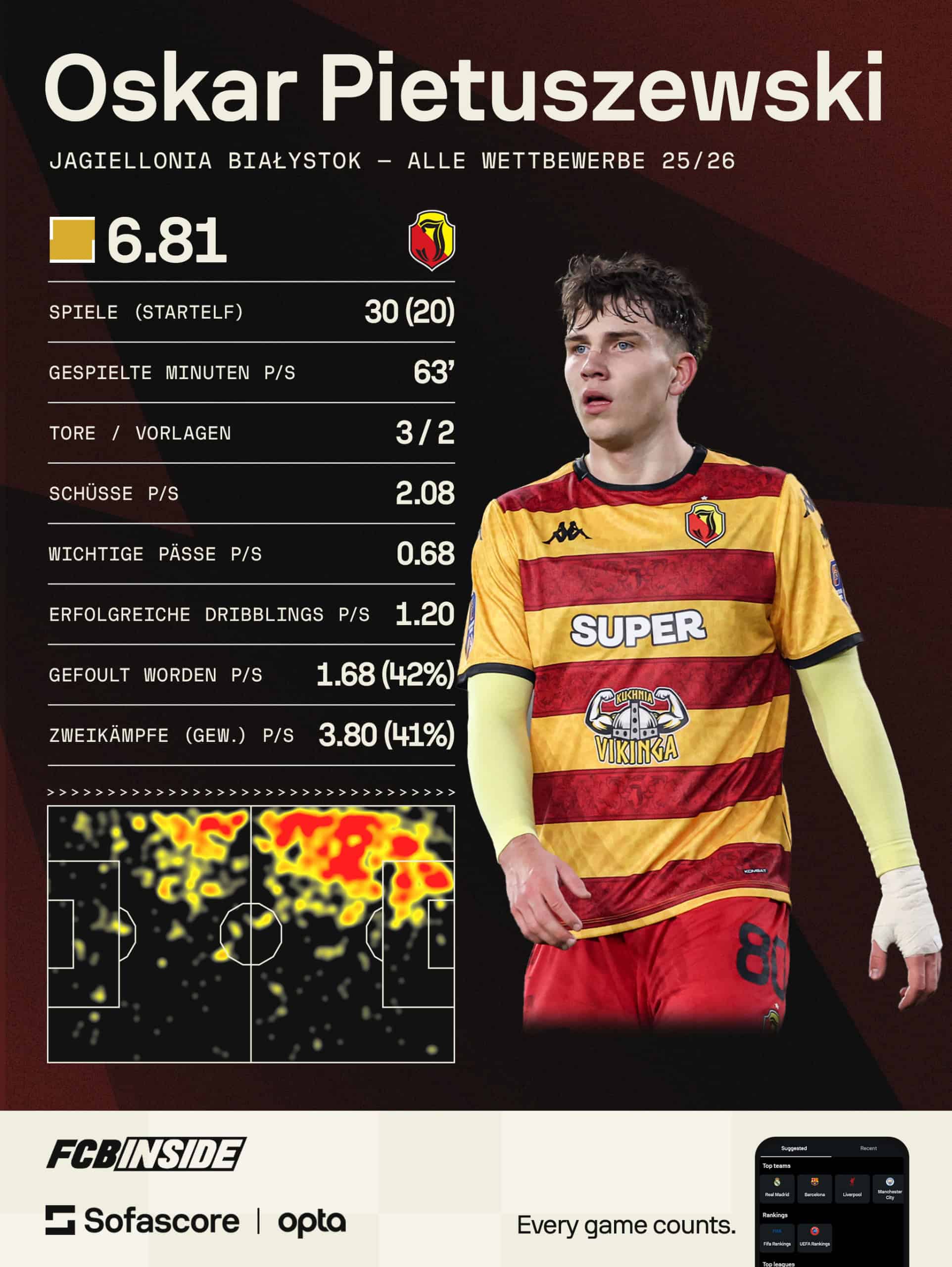 Der Besuch soll kein Zufall gewesen sein. Demnach beobachten die Münchner den polnischen Junioren-Nationalspieler bereits seit geraumer Zeit. Pietuszewski gilt als technisch starker, dynamischer Außenspieler mit viel Entwicklungspotenzial – genau der Spielertyp, den Bayern in dieser Kaderrolle sucht. In der laufenden Saison der Ekstraklasa kommt er auf 16 Einsätze mit drei Toren und zwei Vorlagen, sein Marktwert liegt aktuell bei rund zwölf Millionen Euro.