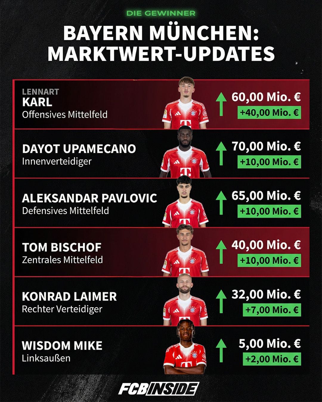 Neben Karl konnten auch weitere Bayern-Spieler ihren Wert steigern. Aleksandar Pavlovic bestätigt seinen Status als Zukunftsspieler und legt ebenso deutlich zu wie Dayot Upamecano, der trotz Vertragsdiskussionen sportlich weiter als Abwehrsäule wahrgenommen wird. Auch Tom Bischof profitiert von seiner positiven Entwicklung und rückt im internen Ranking weiter nach oben. Alle drei konnten jeweils um zehn Millionen Euro zulegen.