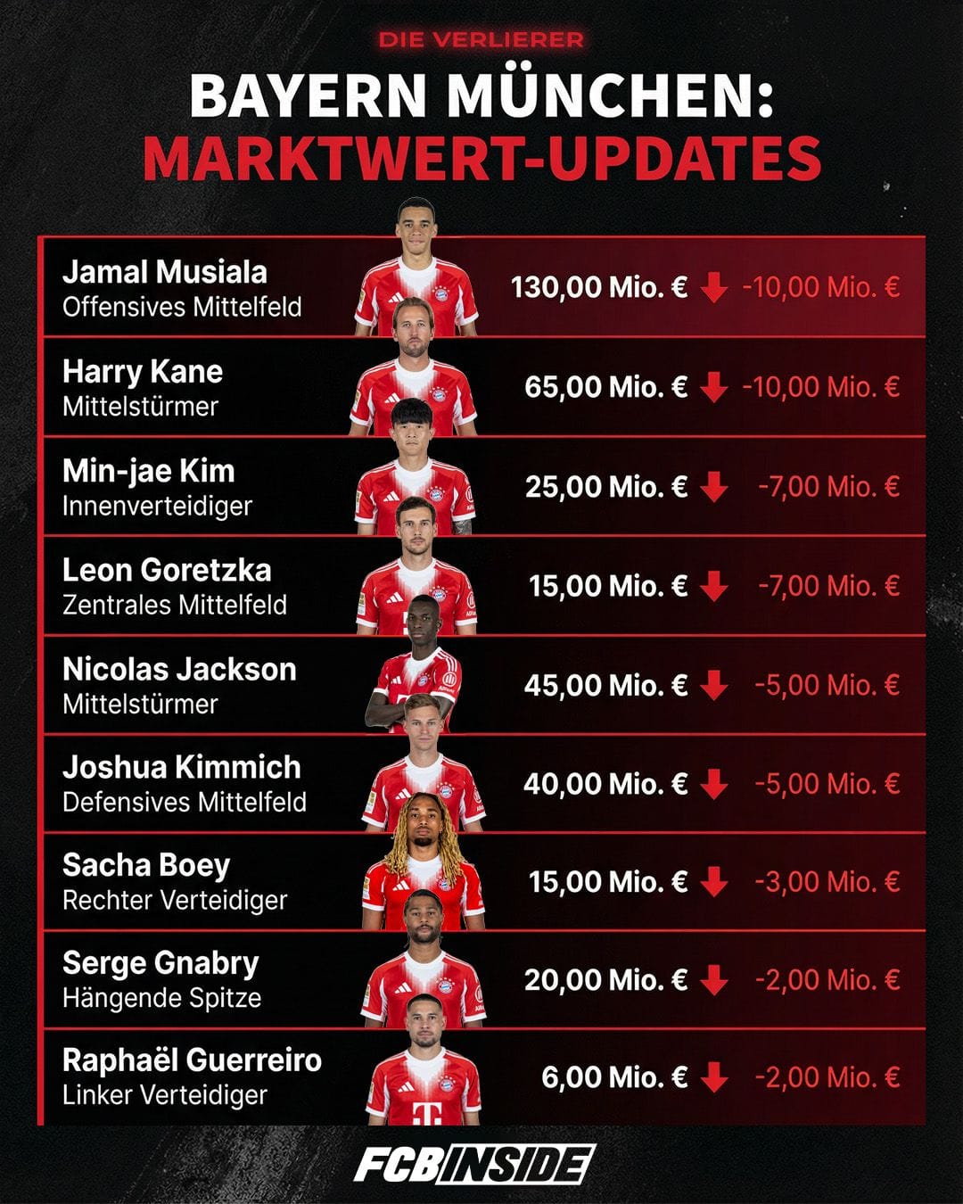 Weitere Abwertungen betreffen unter anderem Minjae Kim und Leon Goretzka (jeweils -7 Millionen Euro), deren Rollen im Kader zuletzt weniger klar definiert waren. Joshua Kimmich (-7 Millionen Euro) verliert ebenfalls leicht, bleibt aber weiterhin einer der wertvollsten Mittelfeldspieler der Liga. Bei Spielern wie Serge Gnabry oder Raphael Guerreiro (jeweils -2 Millionen Euro)spiegeln die Anpassungen vor allem die auslaufenden Verträge wider.