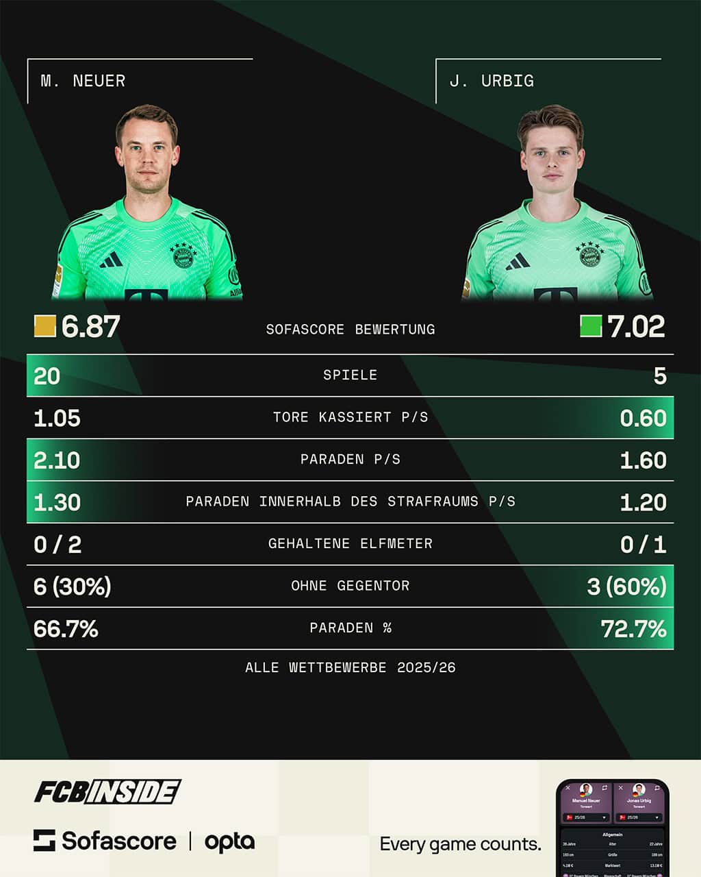 Noch gibt es keine Diskussion um die Hierarchie. Neuer steht vorne, Urbig dahinter. Doch die Eindrücke der Hinrunde zeigen: Die Uhr tickt. Urbig bringt alles mit, um mittelfristig mehr zu sein als ein solider Vertreter. Die Fakten sprechen bereits jetzt für ihn: bessere Quote, höhere Bewertung, starke Entwicklung.