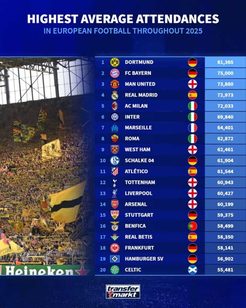 Platz drei geht an Manchester United mit 73.880 Zuschauern im Schnitt, gefolgt von Real Madrid auf Rang vier mit 72.973. Beide Klubs verfügen über weltweite Fanbasen, doch selbst diese globalen Marken kommen nicht an die Spitzenwerte der Bundesliga heran. Auffällig ist dabei: Während in England und Spanien einzelne Vereine herausragen, präsentiert sich Deutschland in der Breite außergewöhnlich stark.