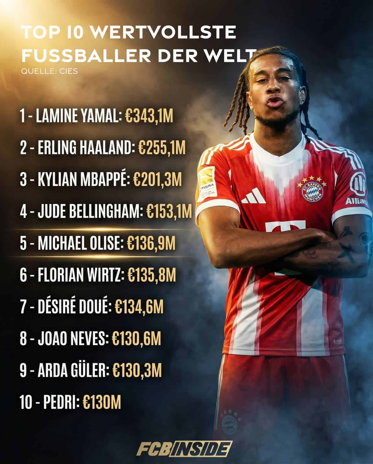 Für Bayern-Fans ist vor allem der Blick dahinter spannend. Jude Bellingham rangiert mit 153,1 Millionen Euro auf Platz vier – und direkt dahinter kommt bereits Michael Olise. Der Bayern-Star landet mit 136,9 Millionen Euro auf Rang fünf und ist damit der wertvollste Spieler der Bundesliga nach dieser CIES-Bewertung. Florian Wirtz folgt mit 135,8 Millionen Euro unmittelbar dahinter auf Platz sechs und ist zugleich der einzige Deutsche in den Top 10.