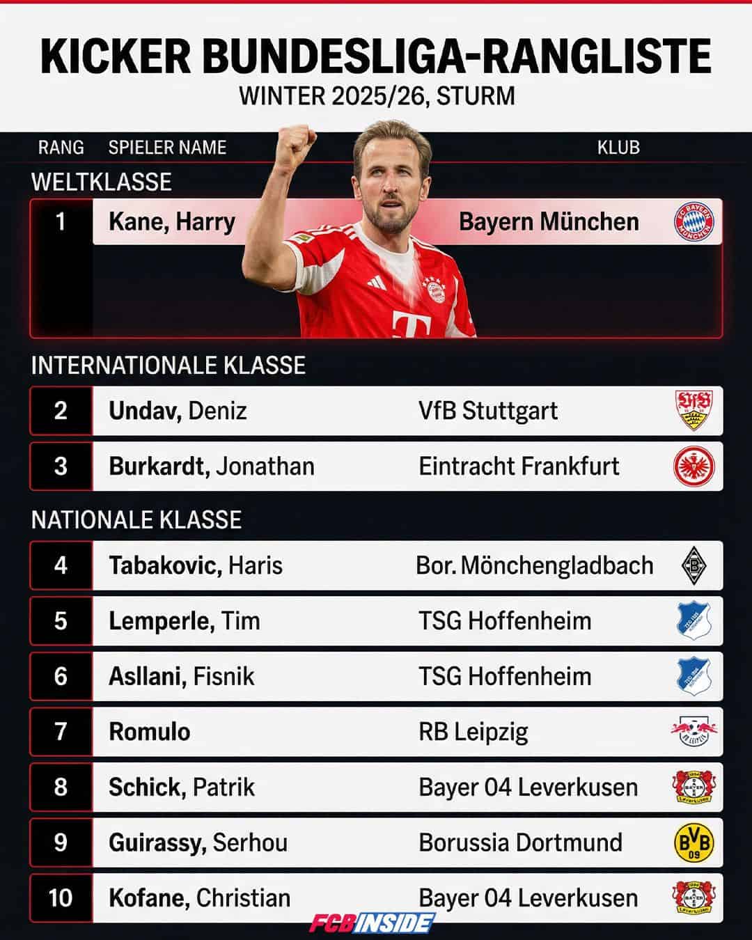 Die neue Winter-Rangliste des kicker für die besten Stürmer in der Bundesliga sorgt für klare Verhältnisse – und für reichlich Diskussionen. Während Borussia Dortmunds Serhou Guirassy einen massiven Absturz hinnehmen muss, steht mit Harry Kane wieder ein Profi des FC Bayern ganz oben. Der Engländer wird vom Fachmagazin erneut in die Kategorie „Weltklasse“ eingestuft und ist damit unangefochten die Nummer eins unter den Bundesliga-Stürmern.