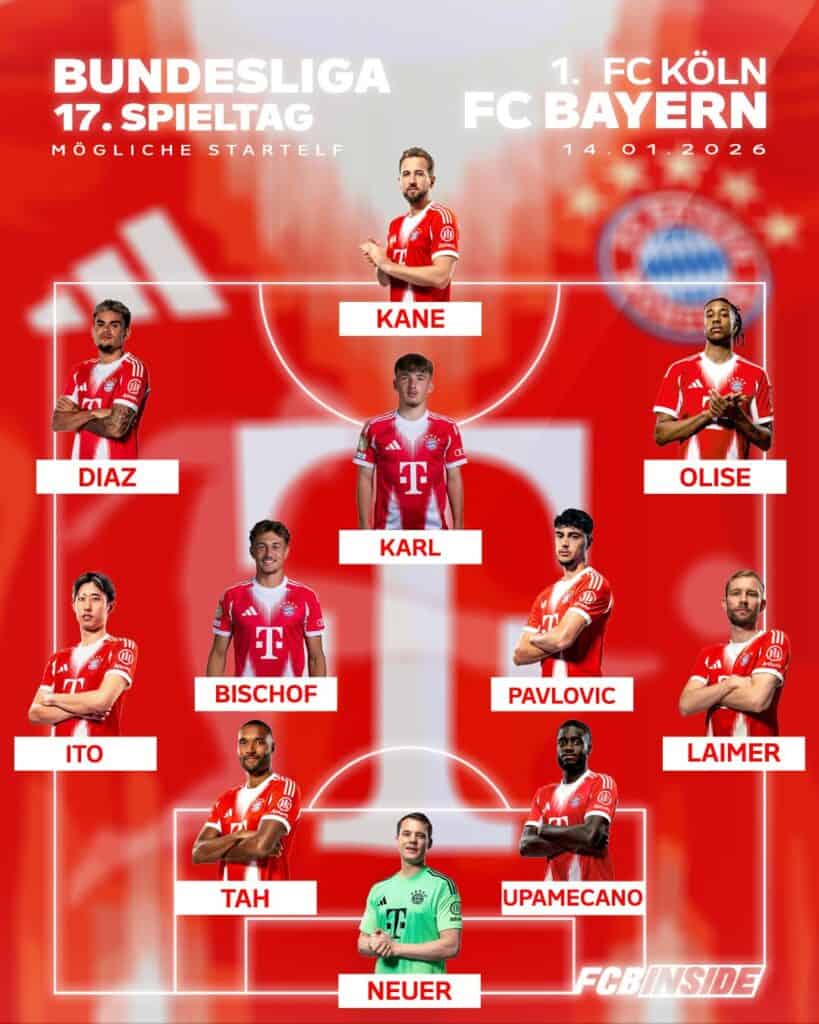 Die voraussichtliche Bayern-Startelf im Überblick: Neuer – Laimer, Upamecano, Tah, H. Ito – Bischof, Pavlovic – Olise, Karl, Luis Diaz – Kane