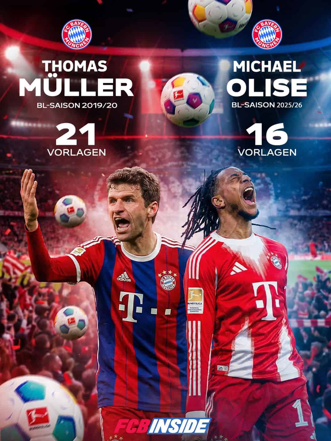 Mit inzwischen 16 Vorlagen in 19 Spielen in der Bundesliga spielt Olise statistisch auf einem Niveau, das selbst in München Seltenheitswert hat. Seine Quote von 0,8 Assists pro Partie würde hochgerechnet locker reichen, um den bisherigen Bundesliga-Rekord von Thomas Müller aus der Triple-Saison 2019/20 zu übertreffen. Damals kam Müller auf 21 Torvorlagen – eine Marke, die über Jahre als nahezu unerreichbar galt.