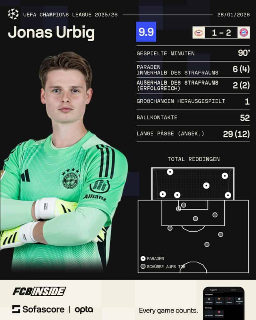 Urbig zahlte das Vertrauen gegen PSV mit einer starken Leistung zurück. Der Torwart parierte sechs Bälle, vier davon aus kurzer Distanz im Strafraum, und zeigte sich auch im Spielaufbau sehr präsent. Mehrfach leitete er mit präzisen langen Bällen Angriffe ein, so auch beim 2:1-Siegtreffer von Harry Kane, und agierte insgesamt äußerst aktiv. Von Sofascore erhielt Urbig die Note 9,9 und wurde auch von der UEFA zum Spieler des Spiels gewählt.