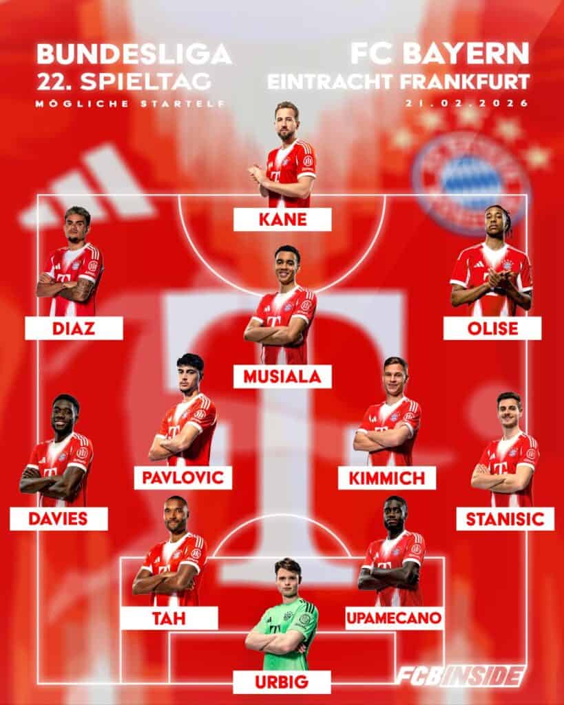 Die voraussichtliche Bayern-Startelf im Überblick: Urbig – Stanisic, Upamecano, Tah, Davies – Kimmich, Pavlovic – Olise, Musiala, Luis Diaz – Kane