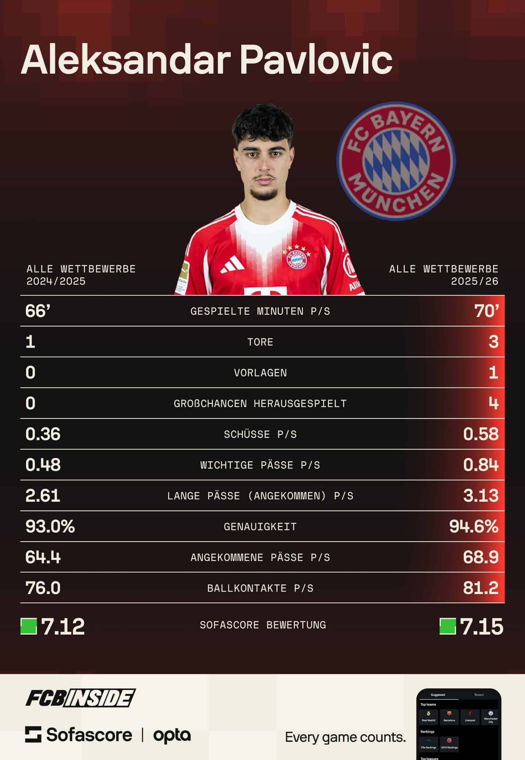 Auch bei den Ballaktionen pro Partie gehört Pavlovic zur absoluten Spitze. Mit 112 Aktionen pro Spiel rangiert er ligaweit auf Platz drei – hinter Garcia und Joshua Kimmich. Seine Passquote von 95 Prozent bedeutet Platz vier insgesamt, unter den Mittelfeldspielern sogar Rang eins. Im Vergleich zur vergangenen Saison hat sich der gebürtige Münchner in nahezu allen statistischen Kategorien verbessert.
