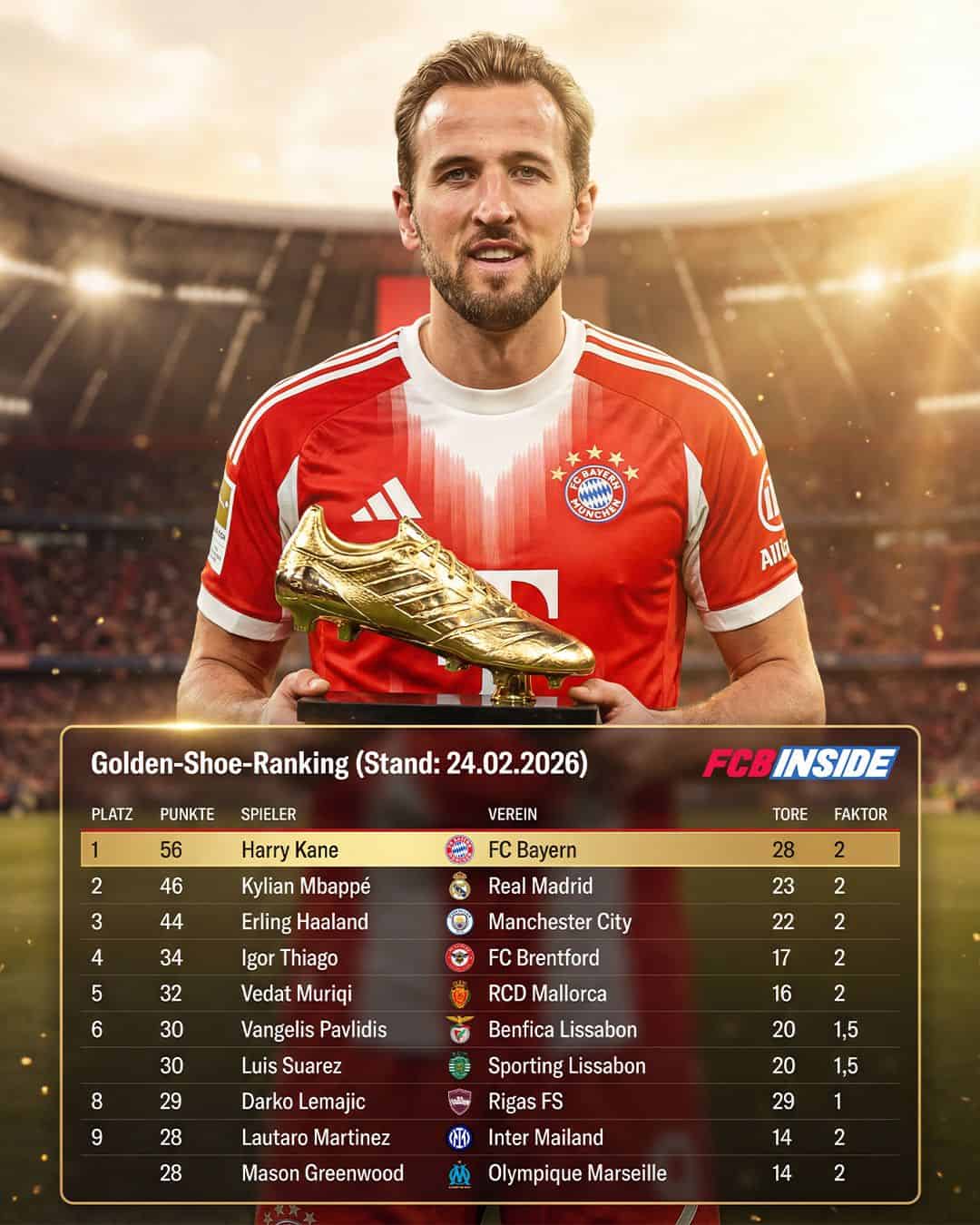 An der Spitze aber thront derzeit unangefochten Harry Kane. Mit 28 Toren nach 23 Spieltagen sendet der Bayern-Stürmer eine klare Botschaft an Europas Konkurrenz – und scheint fest entschlossen, sich in dieser Saison endlich auch die Golden Shoe zu sichern.