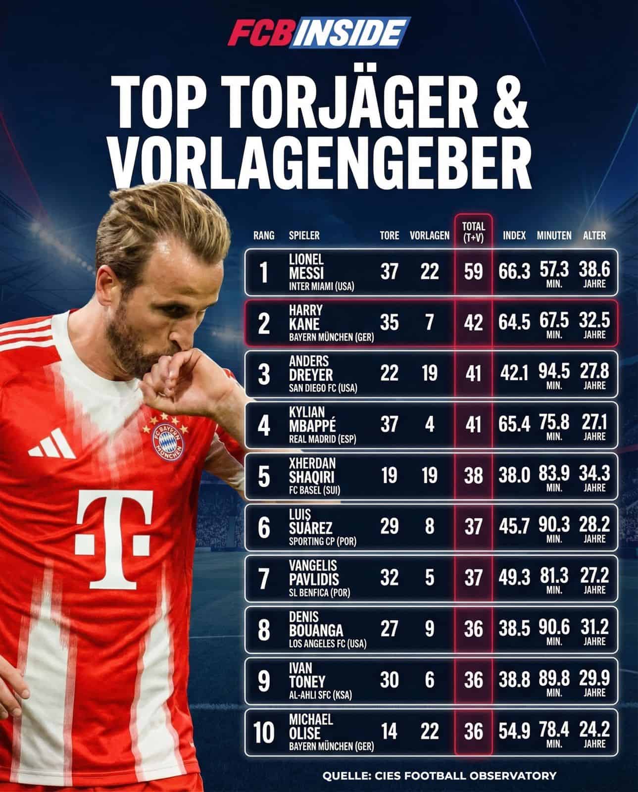 Direkt hinter Messi folgen mehrere absolute Topstars des Weltfußballs – darunter auch zwei Spieler des FC Bayern. Harry Kane belegt mit 42 Scorerpunkten (35 Tore und sieben Assists) den zweiten Platz im Ranking. Kylian Mbappé folgt mit 41 Torbeteiligungen dicht dahinter.