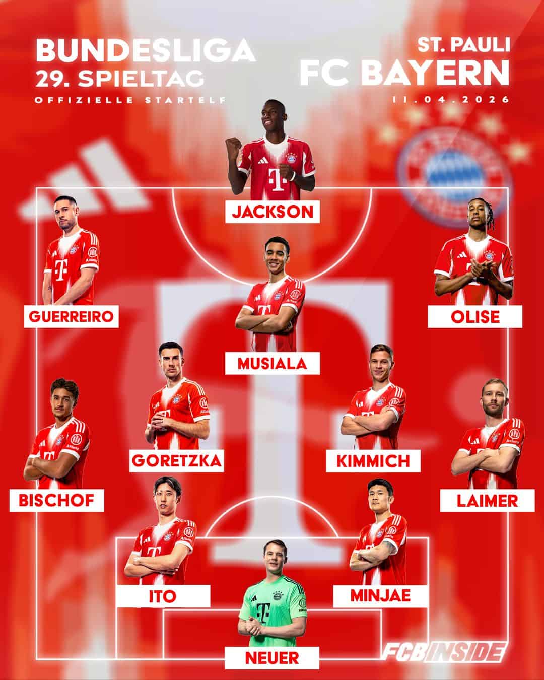 FC Bayern: Neuer – Laimer, M.-J. Kim, H. Ito, Bischof – Goretzka, Kimmich – Olise, Guerreiro, Musiala – Jackson