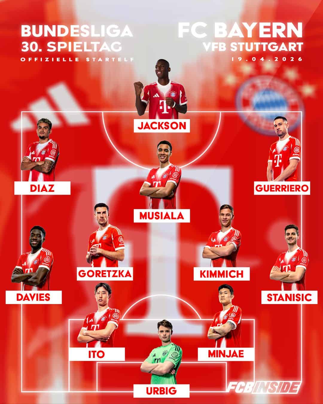 FC Bayern: Urbig – Stanisic, M.-J. Kim, H. Ito, Davies – Goretzka, Kimmich – Guerreiro, Musiala, Díaz – Jackson