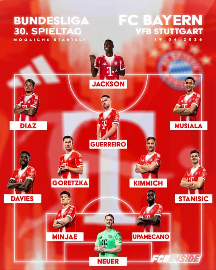 FC Bayern: Neuer – Stanisic, Upamecano, M.-J. Kim, Davies – Kimmich, Goretzka – Musiala, Guerreiro, Luis Diaz – Jackson