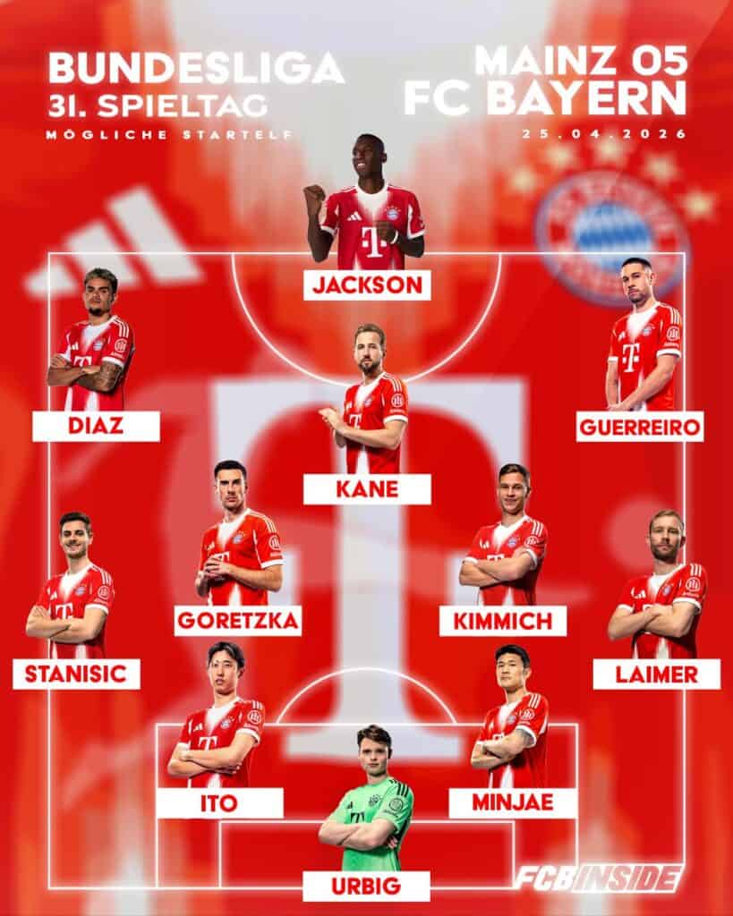 FC Bayern: Urbig – Stanisic, M.-J. Kim, H. Ito, Laimer – Kimmich, Goretzka – Guerreiro, Kane, Luis Diaz – Jackson